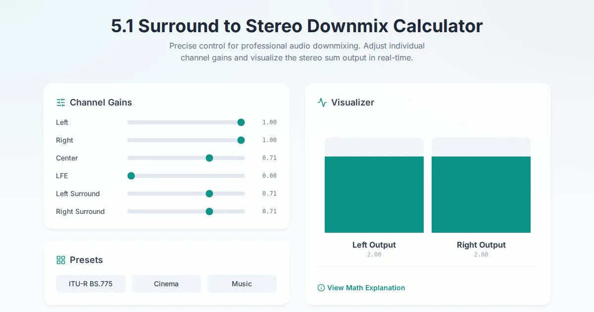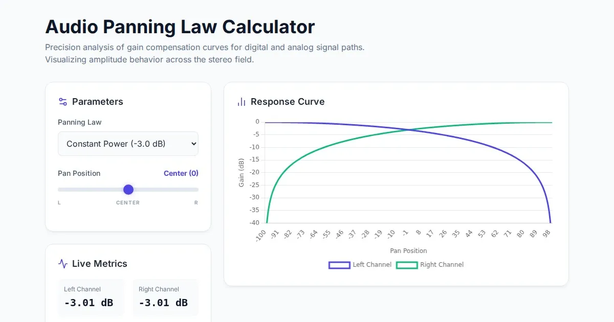 Calculate and visualize audio panning law curves, center dip compensation, and gain adjustments. Free professional tool for sound engineers and audio mixing.
