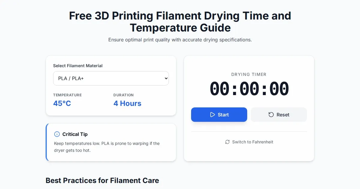 Calculate the optimal drying temperature and time for 3D printing filaments like PLA, PETG, ABS, TPU, and Nylon. Prevent moisture-related print failures now.