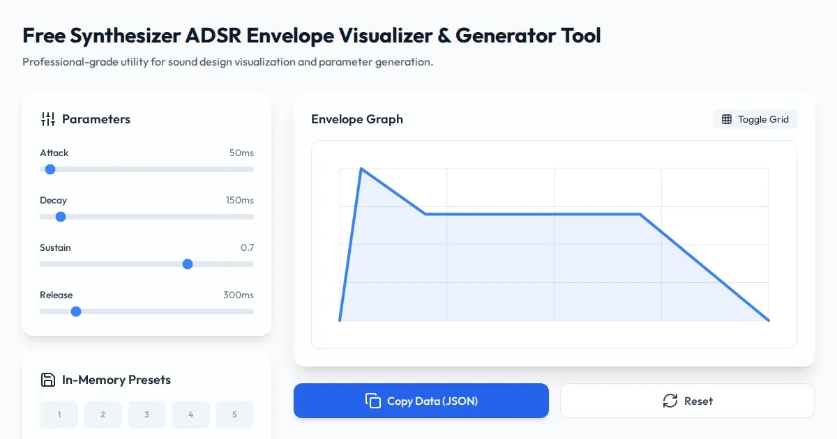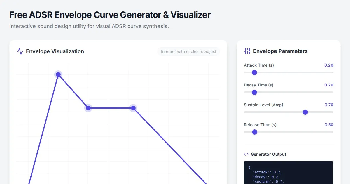 Design and visualize ADSR envelope curves for sound synthesis. A free, browser-based utility to adjust Attack, Decay, Sustain, and Release parameters in real-time.
