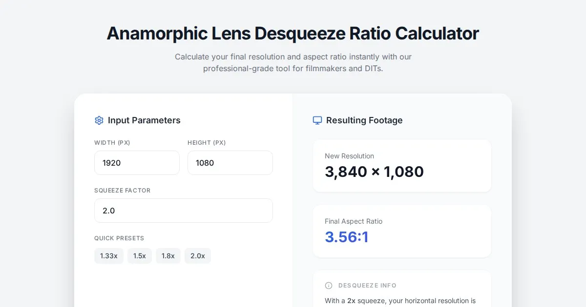 Use this free, web-based anamorphic lens desqueeze ratio calculator to determine your final cinema camera aspect ratio and resolution for professional video editing.