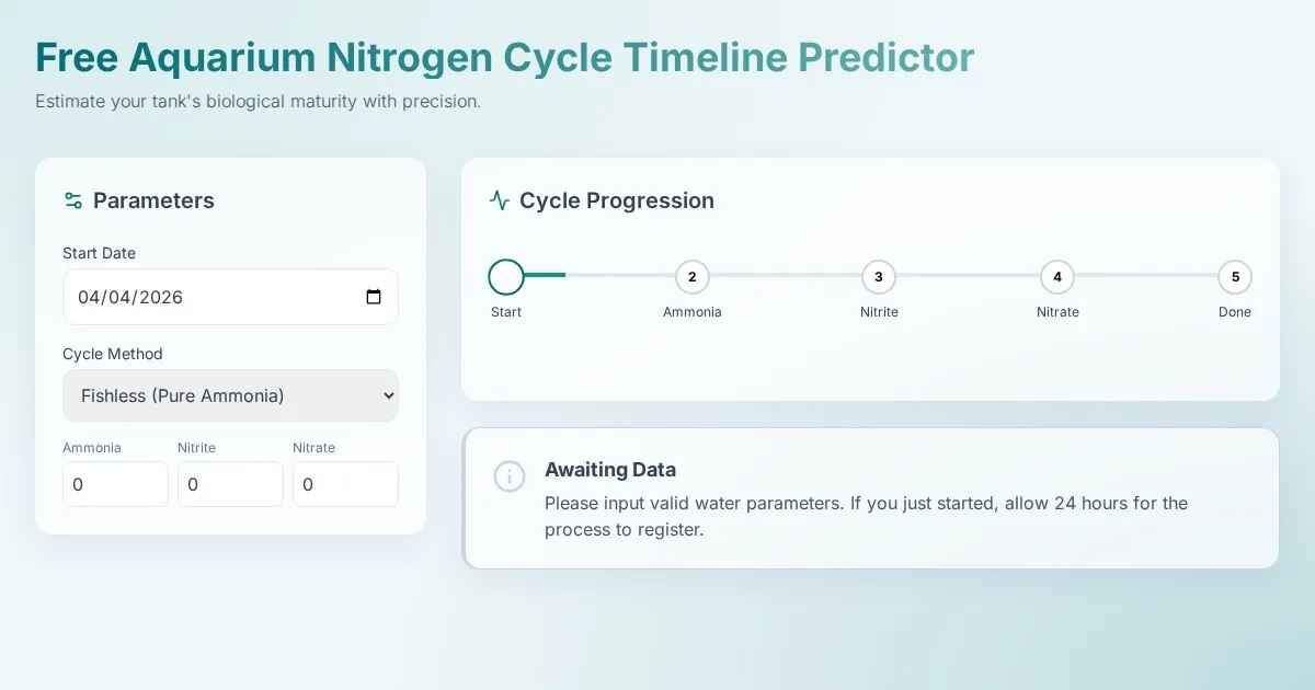Calculate your aquarium's nitrogen cycle timeline with our free ammonia spike predictor. Estimate when your fish tank will finish cycling and be safe for fish.