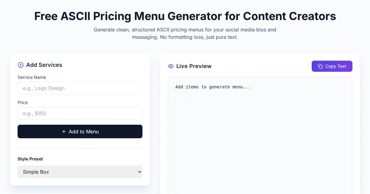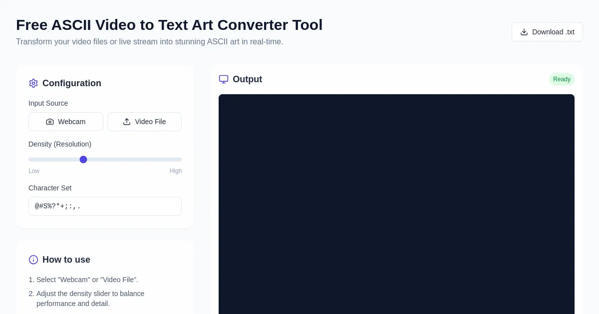 Convert video clips and live webcam feeds into real-time ASCII art. This free browser-based tool transforms video frames into text character art easily.