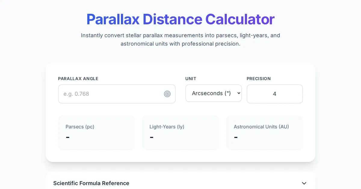 Calculate stellar distances using parallax angles with this free online tool. Convert arcseconds to parsecs and light-years instantly for astronomy research.