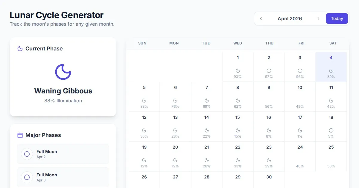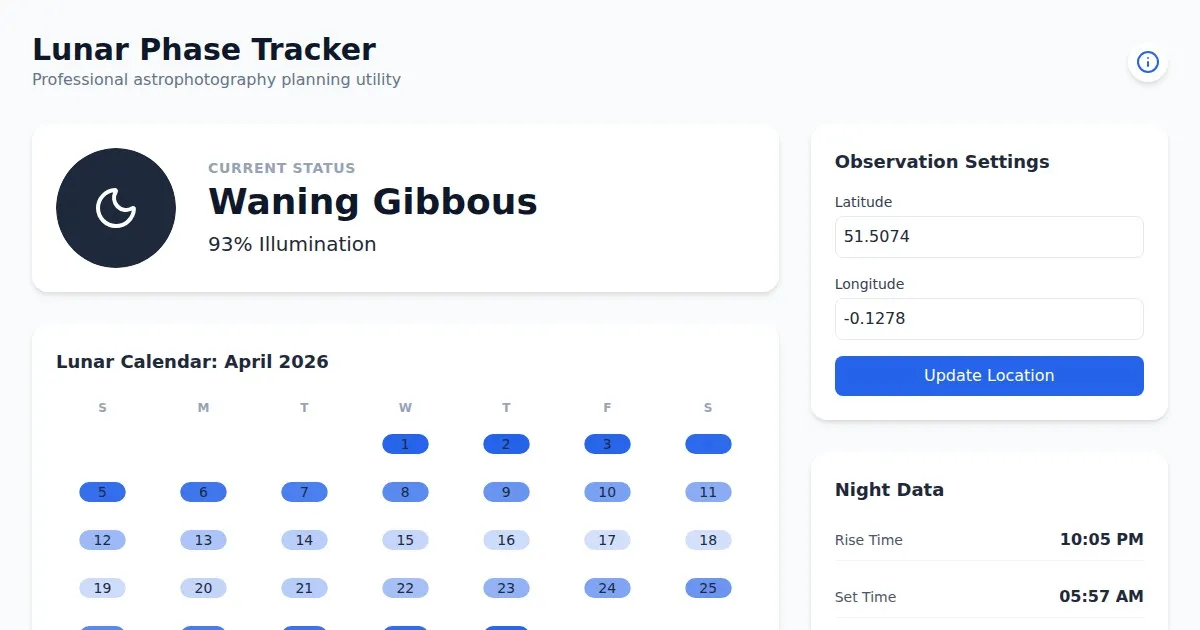 Accurately track moon phases, illumination percentages, and rise/set times for astrophotography. A precise, free web tool for planning your perfect night sky shot.