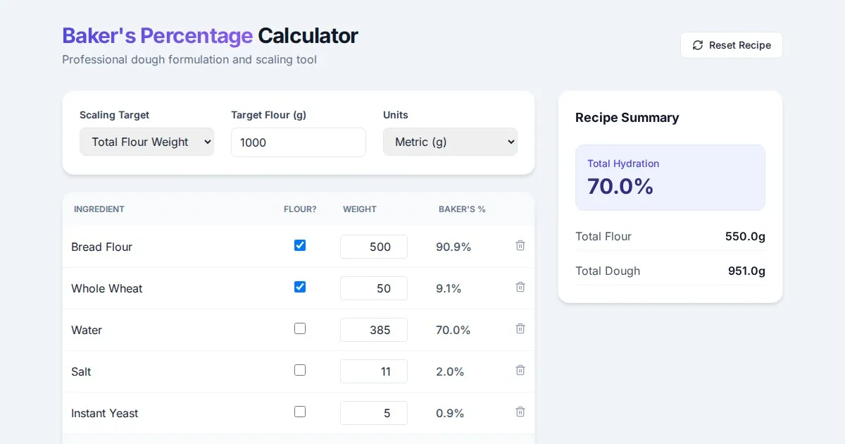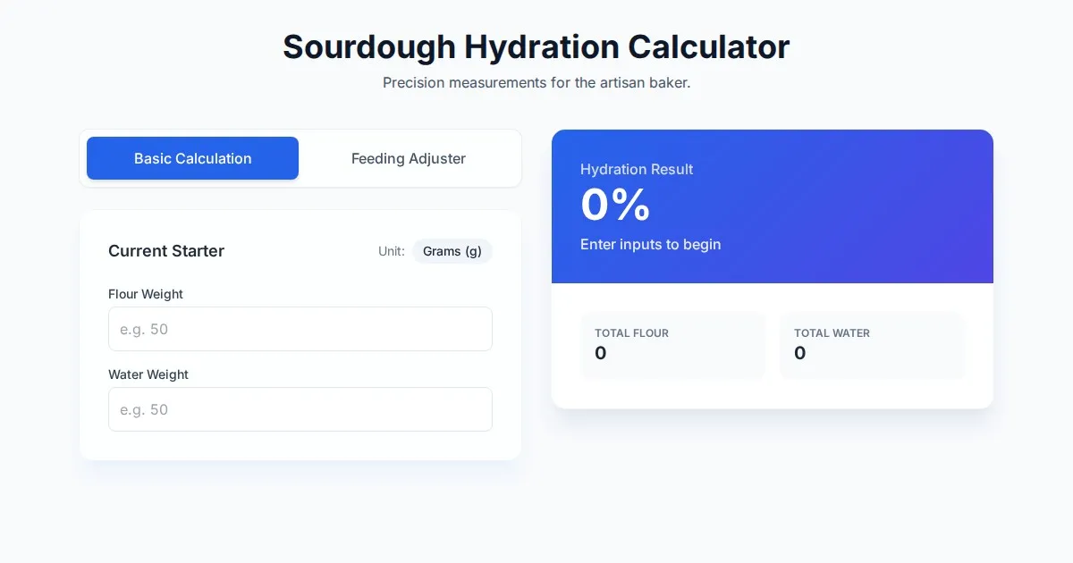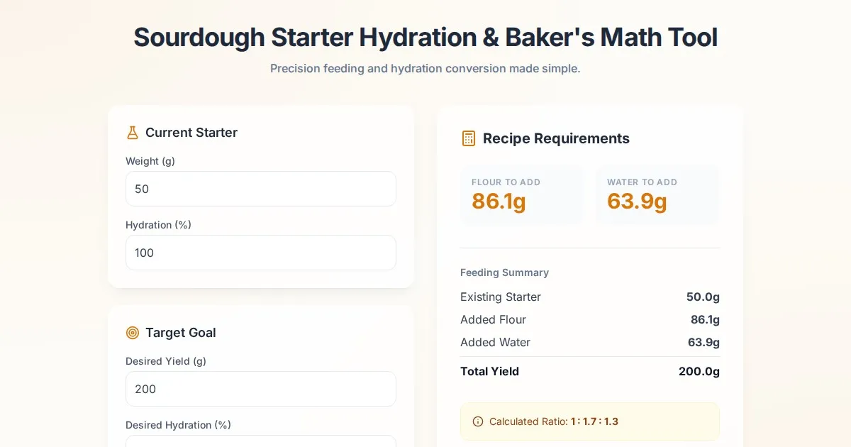 Easily calculate sourdough starter feeding ratios, adjust hydration percentages, and convert starter amounts with this free baker's math tool for home bakers.