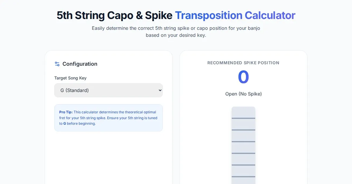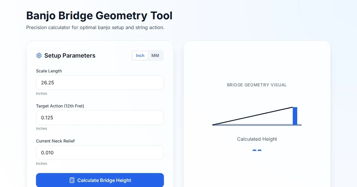 Calculate the perfect banjo bridge height for your instrument. This free tool estimates optimal bridge height based on scale length, neck angle, and string action.