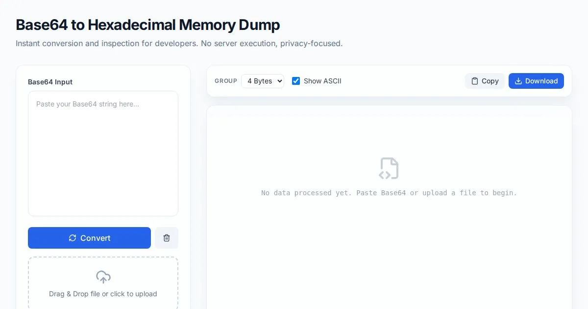 Instantly convert Base64 strings to formatted hexadecimal memory dumps. A private, client-side, browser-based tool for developers, security researchers, and binary analysis.
