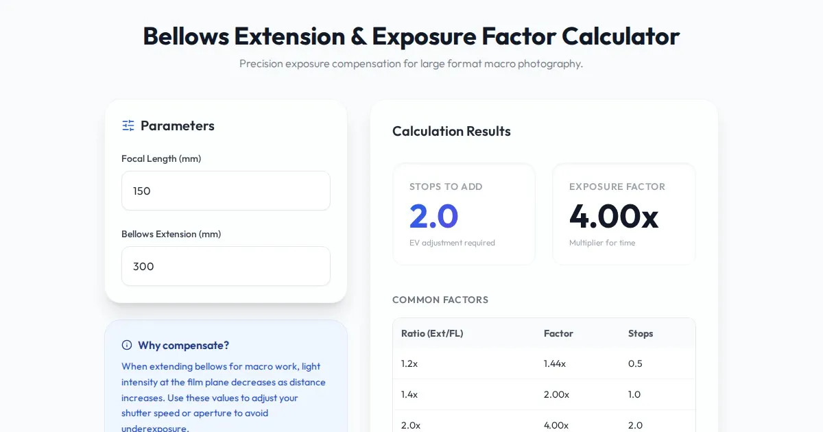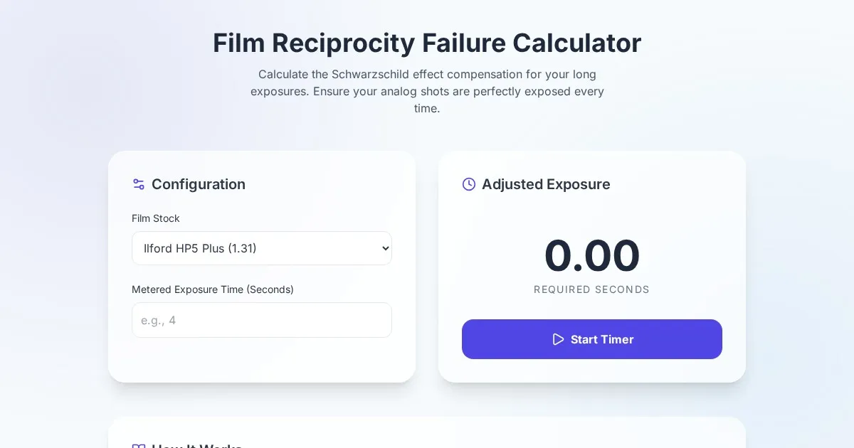 Calculate accurate film exposure times for long exposures. Compensate for reciprocity failure with this free, easy-to-use analog photography adjustment tool.