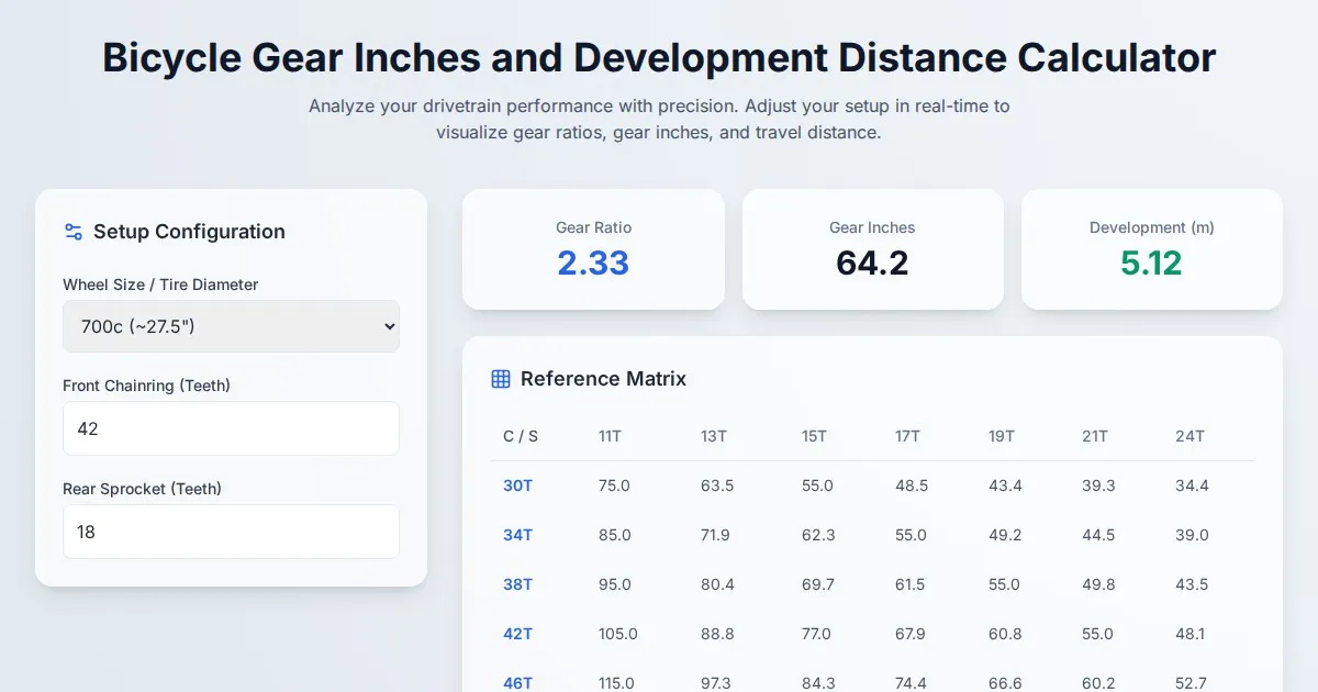 Calculate bicycle gear inches, development distance, and gear ratios instantly. A precise tool for road, mountain, and hybrid bike gear setup optimization.