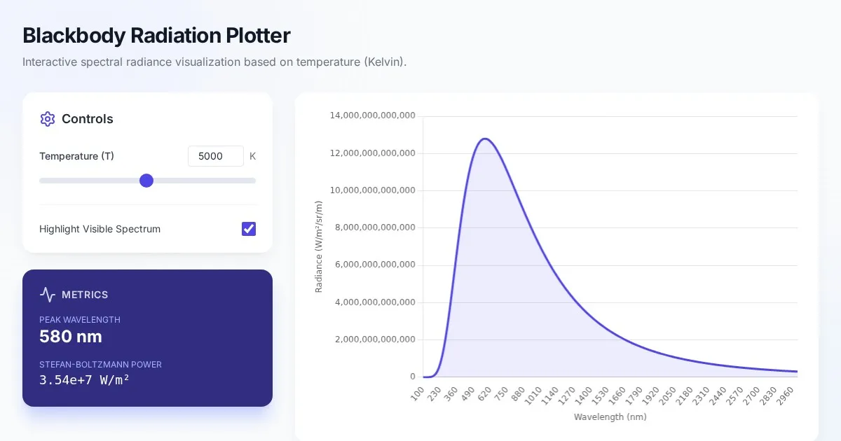 Instantly generate blackbody radiation spectral radiance curves. Use this free online scientific tool to visualize Planck’s Law based on temperature.