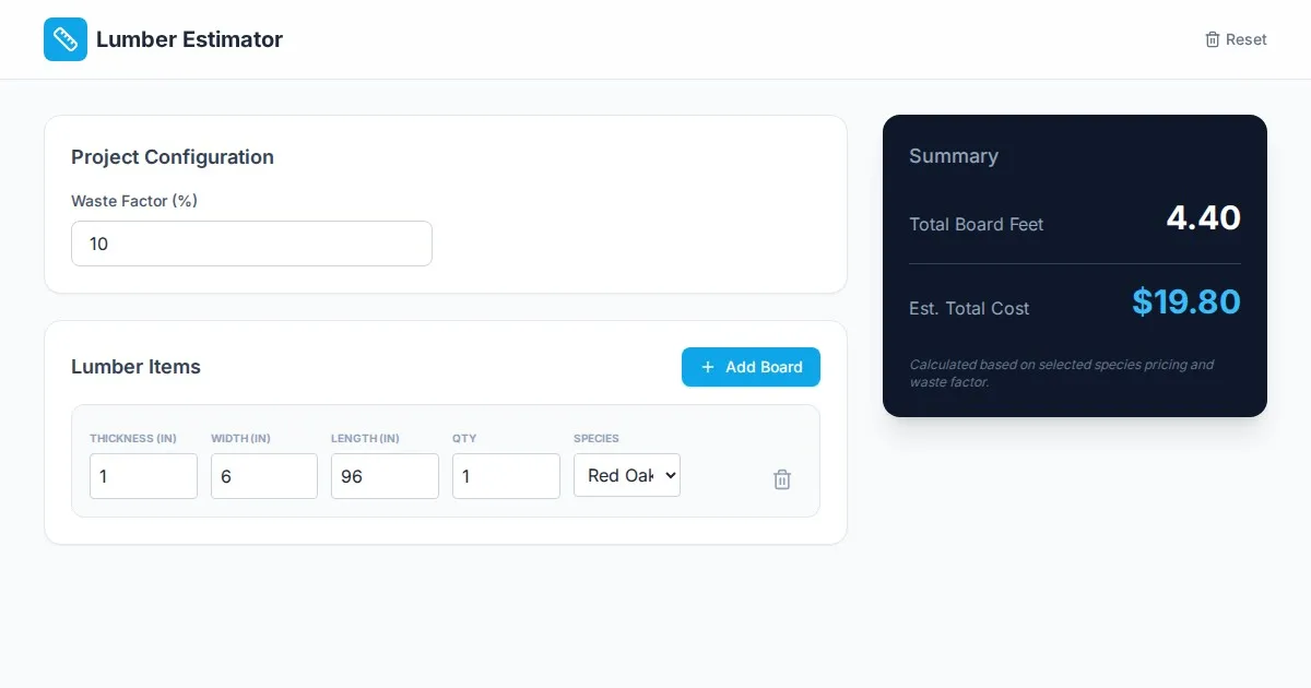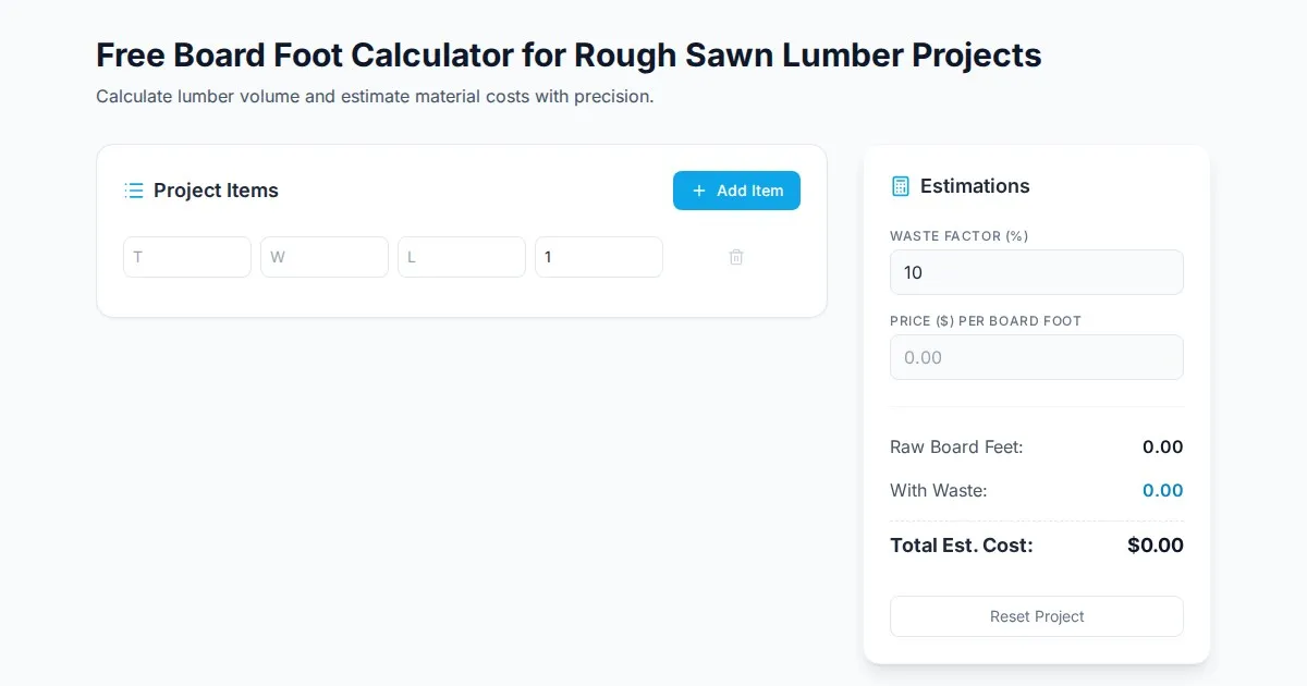 Calculate board feet for woodworking projects instantly. Estimate lumber costs by species, dimensions, and quantity. Free, precise, and user-friendly tool.