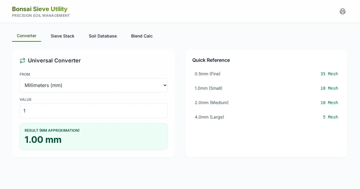 Convert bonsai soil sieve mesh sizes between millimeters, inches, and standard mesh units. Easily calculate perfect particle distributions for healthy bonsai growth.