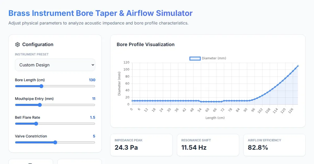 Use this free brass instrument bore taper simulator to visualize airflow dynamics, calculate impedance, and model instrument mouthpipe dimensions instantly.