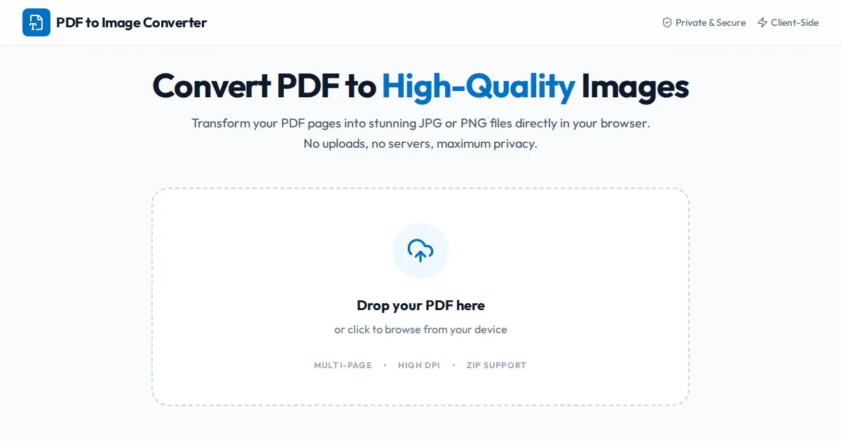 Convert PDF documents to high-resolution JPG or PNG images instantly in your browser. Secure, private, client-side PDF image extraction without uploads.