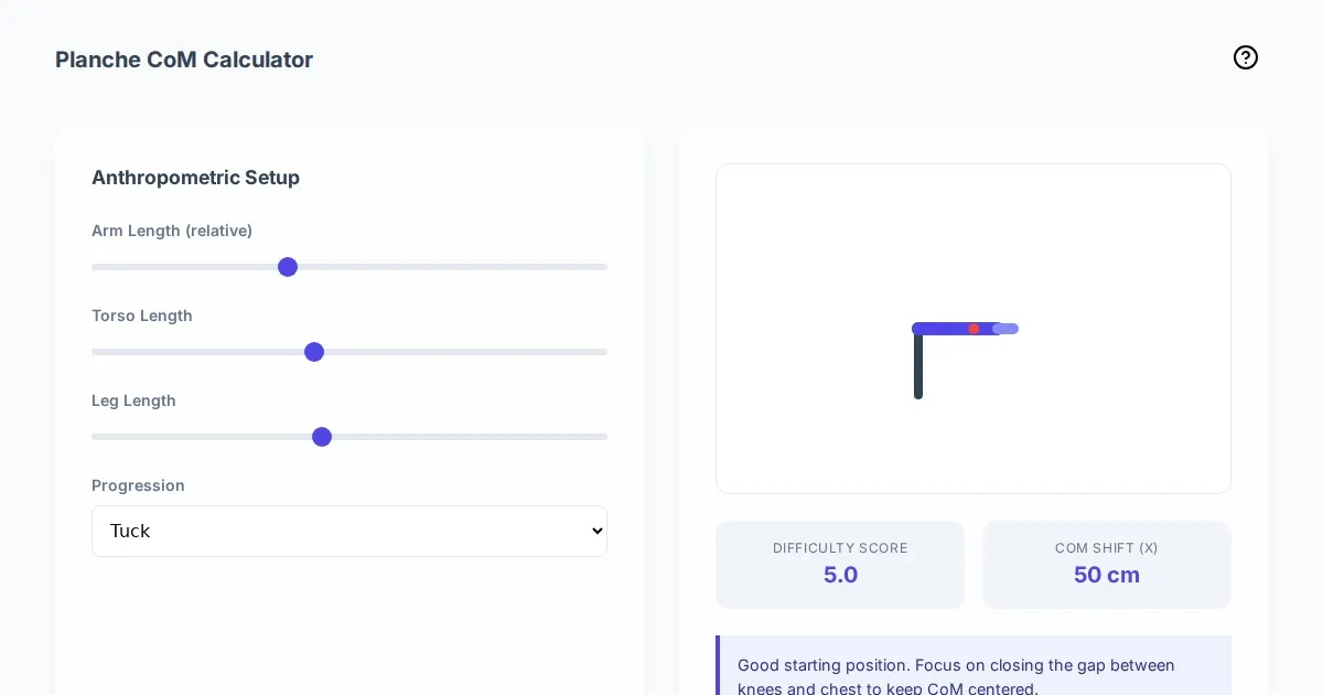 Use our free calisthenics planche center of mass calculator to analyze biomechanical leverage. Optimize your planche training with precise body segment analysis.