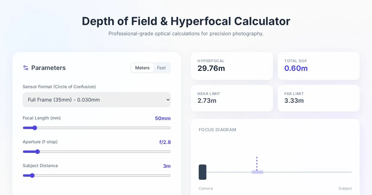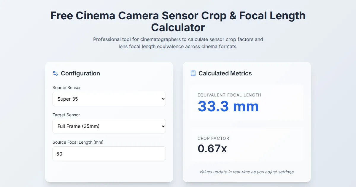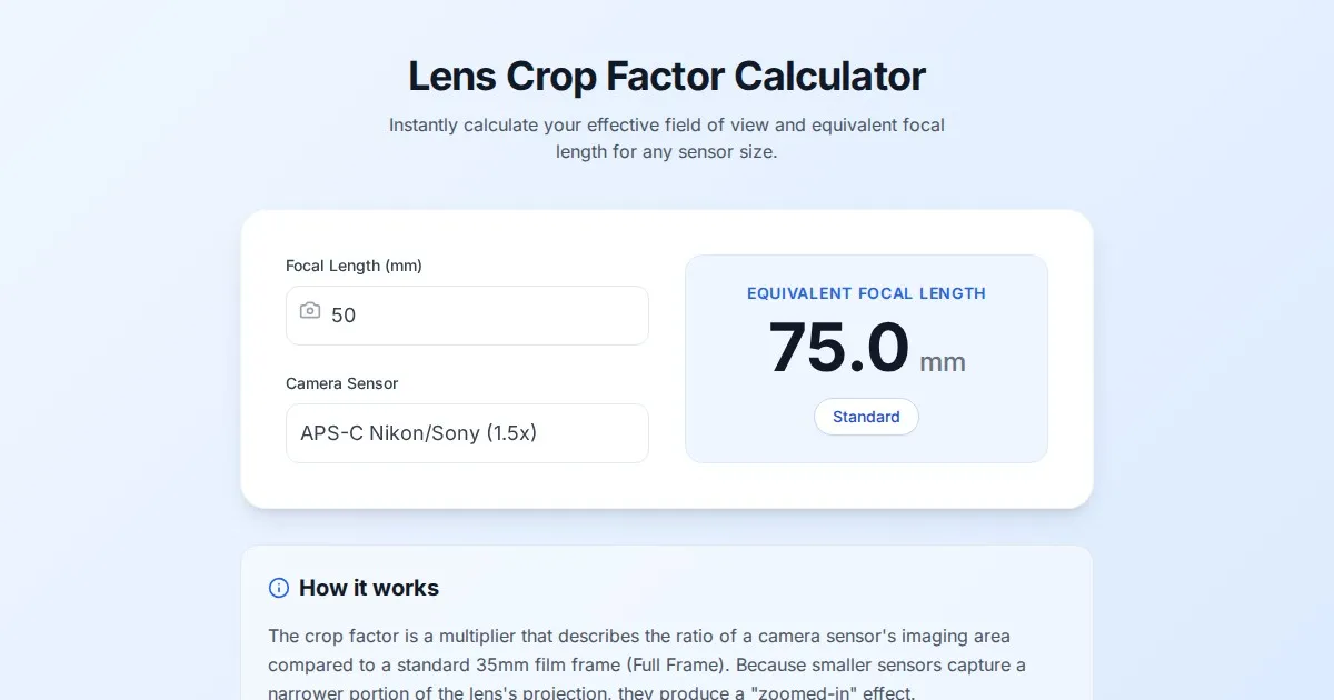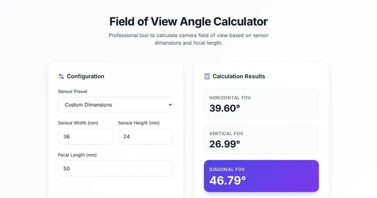 Instantly calculate field of view (FOV) angles based on lens focal length and camera sensor size. Ideal for photographers using full-frame, APS-C, and Micro 4/3.