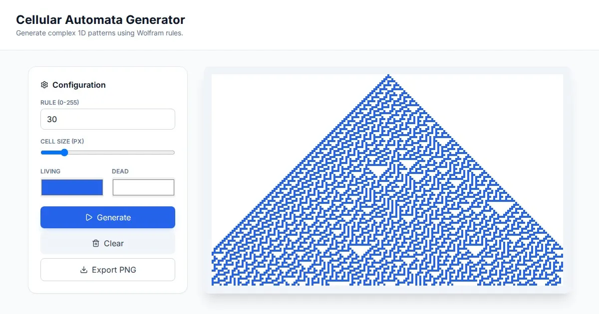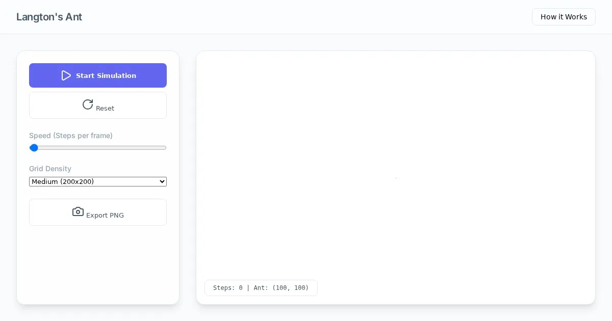 Visualize Langton's Ant cellular automata with this free, browser-based generator. Easily create, customize, and animate emergent patterns from simple rules.