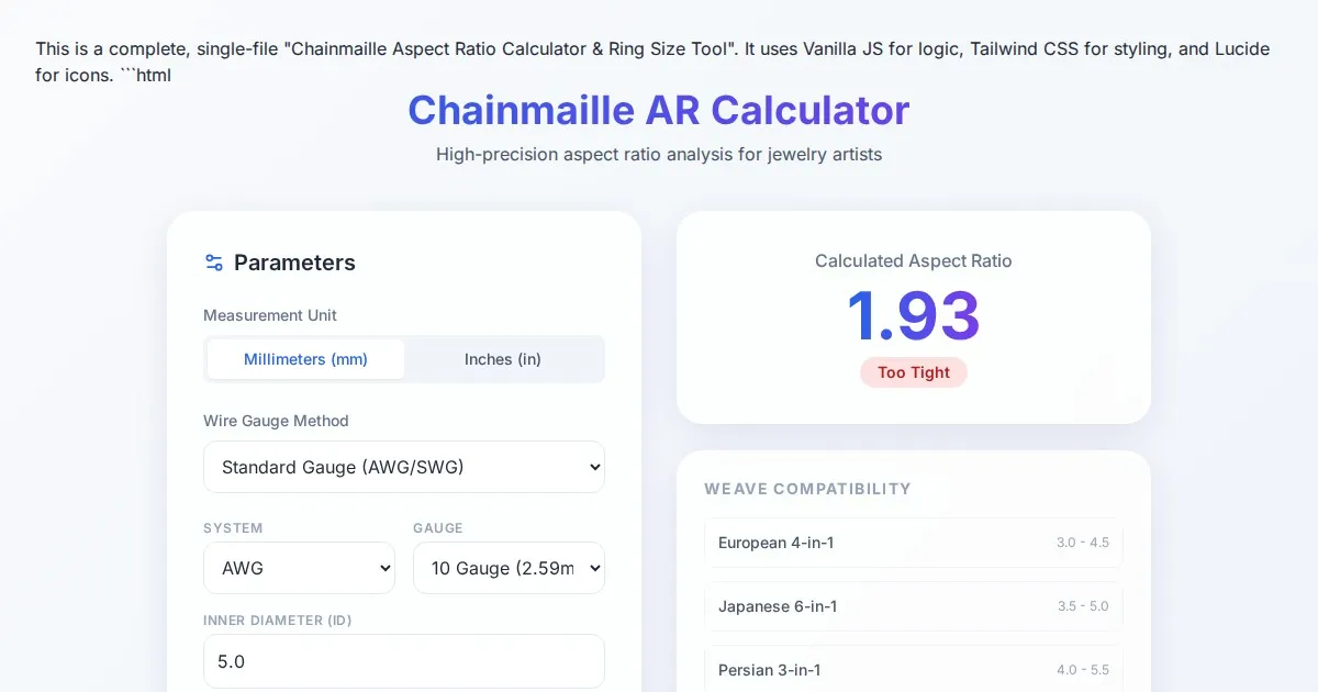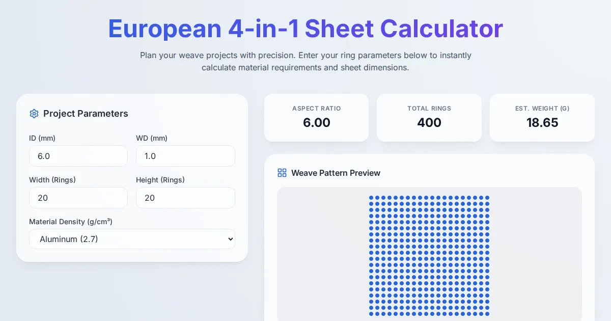 Accurately calculate ring counts, project weight, and dimensions for European 4-in-1 chainmaille sheets with our free, easy-to-use artisan tool.