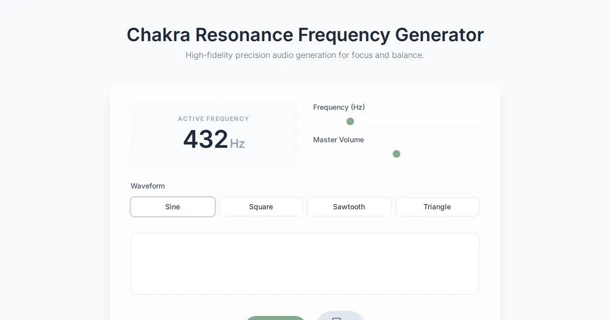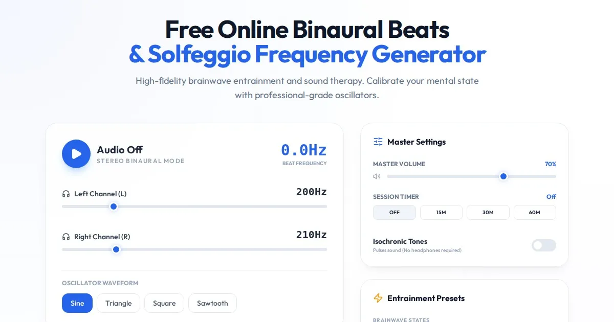 Create custom binaural beats and Solfeggio frequencies online. Free brainwave entrainment tool for meditation, focus, and deep relaxation. No download needed.