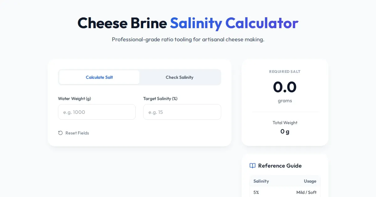 Easily calculate the precise salt-to-water ratio for your cheese brine. Use our free salinity calculator to ensure consistent, high-quality homemade cheese.