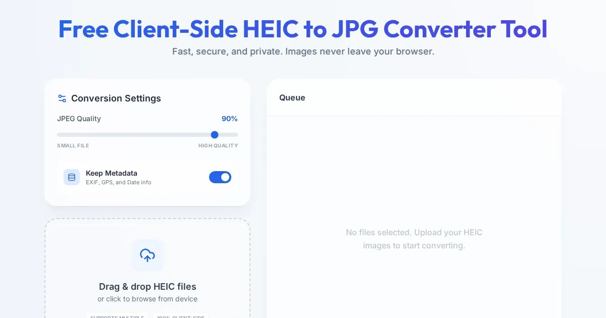 Convert HEIC files to JPG format instantly in your browser. Our secure, private client-side HEIC to JPG converter processes all images locally without uploads.