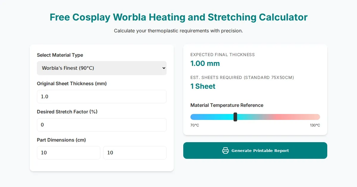 Precisely calculate Worbla material stretching limits, heating requirements, and project yield. A free online tool for professional cosplay armor crafting.