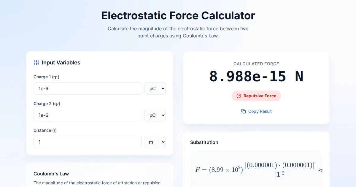 Instantly calculate the electrostatic force between two point charges using this free Coulomb's Law calculator. Perfect for physics students and engineers.
