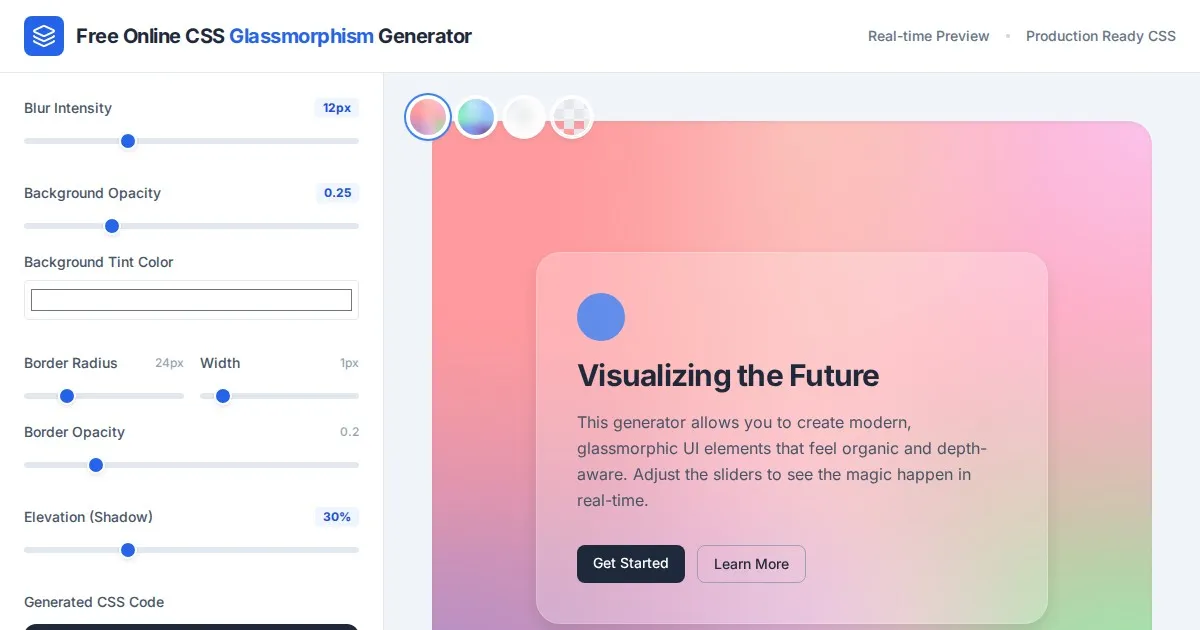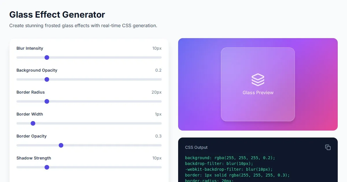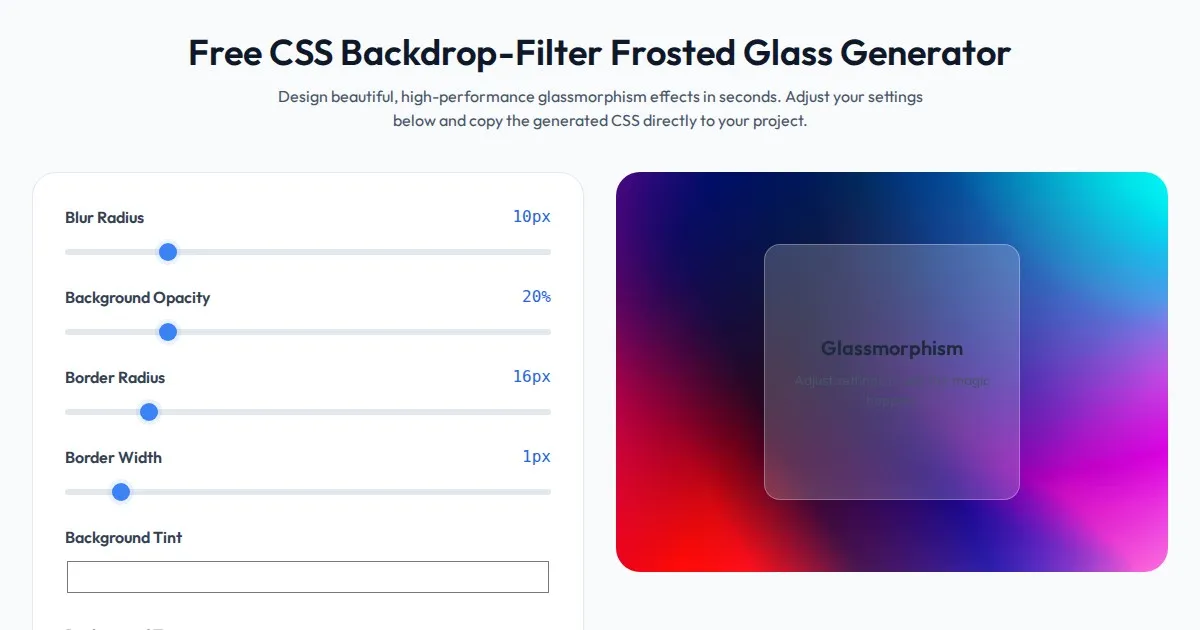Generate custom CSS backdrop-filter frosted glass effects. Configure blur, transparency, and background colors with a live, responsive previewer for your web project.