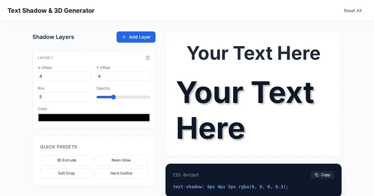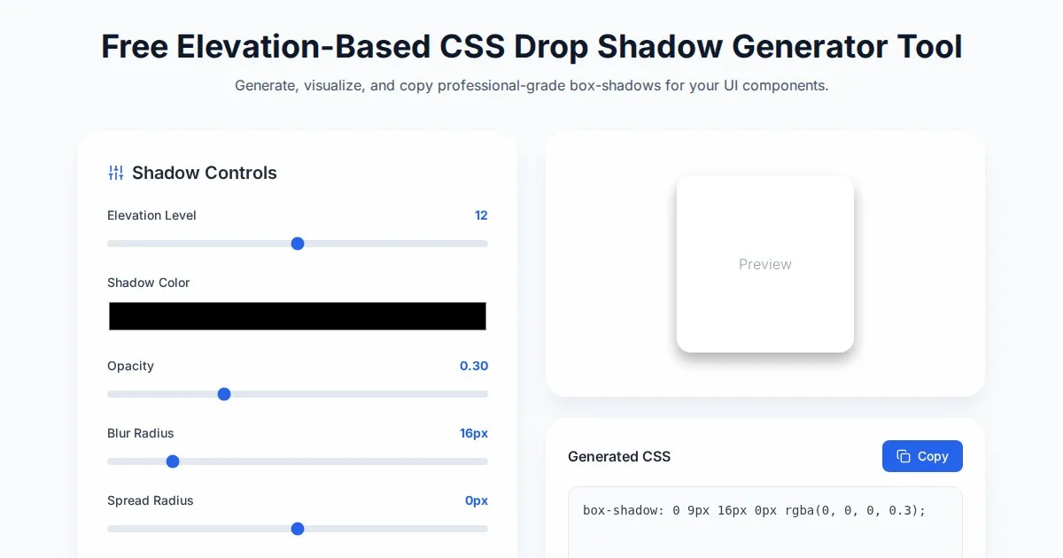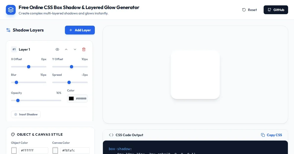 Generate complex, multi-layered CSS box shadows and glows with our free online visual builder. Copy ready-to-use CSS code for your UI projects instantly.
