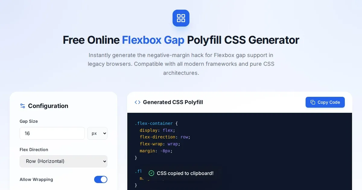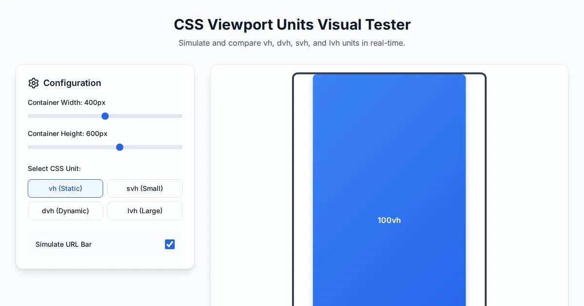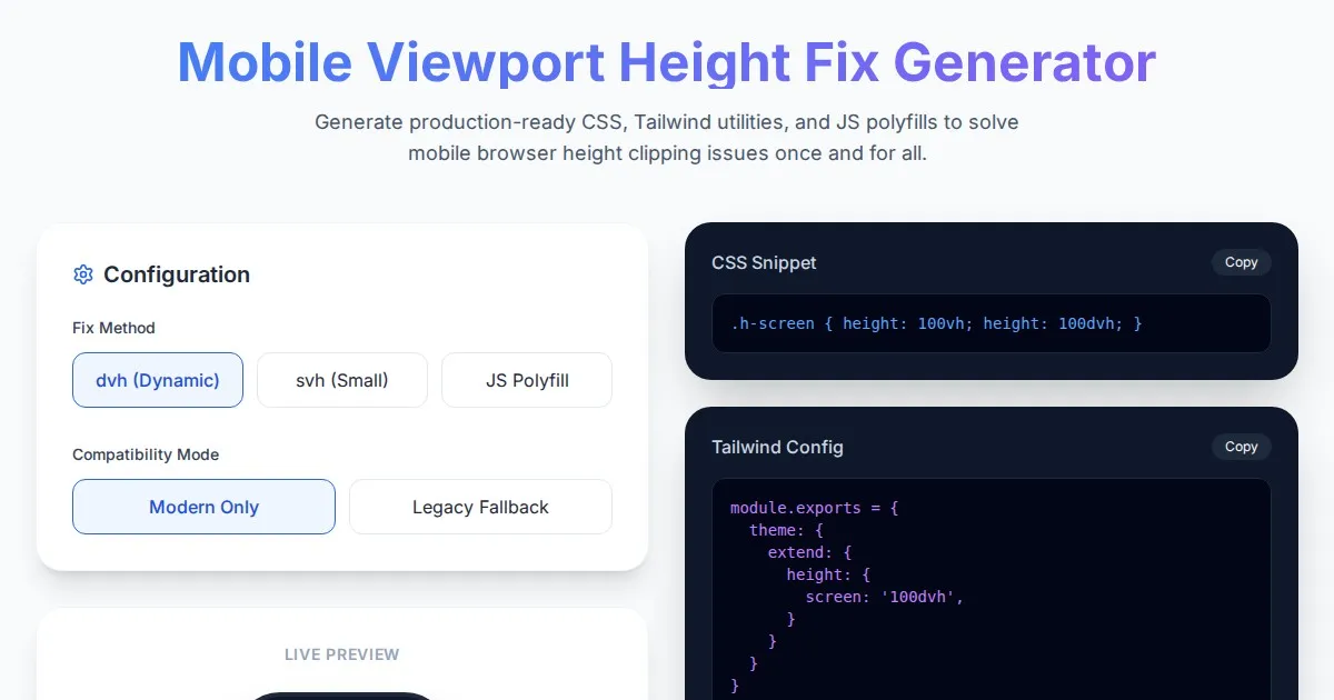 Easily fix min-h-screen issues on mobile browsers. Generate custom CSS, Tailwind utility classes, and JS fallbacks for consistent mobile viewport height (100dvh).