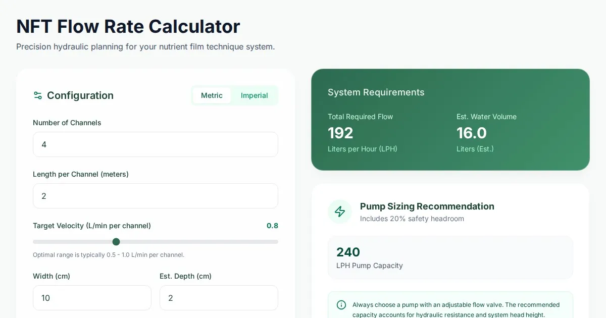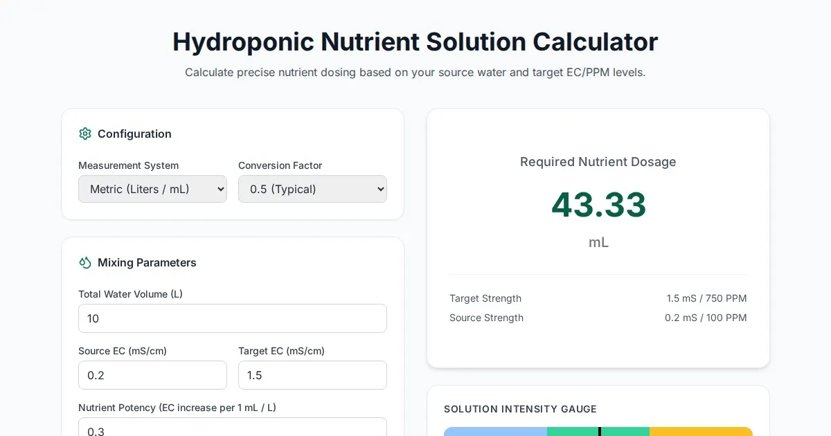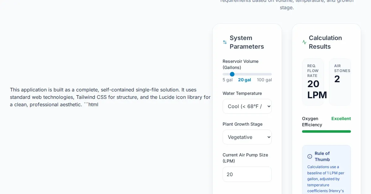 Calculate required air pump flow and aeration for your hydroponic DWC system. Optimize root zone health with our free oxygen saturation estimator for growers.