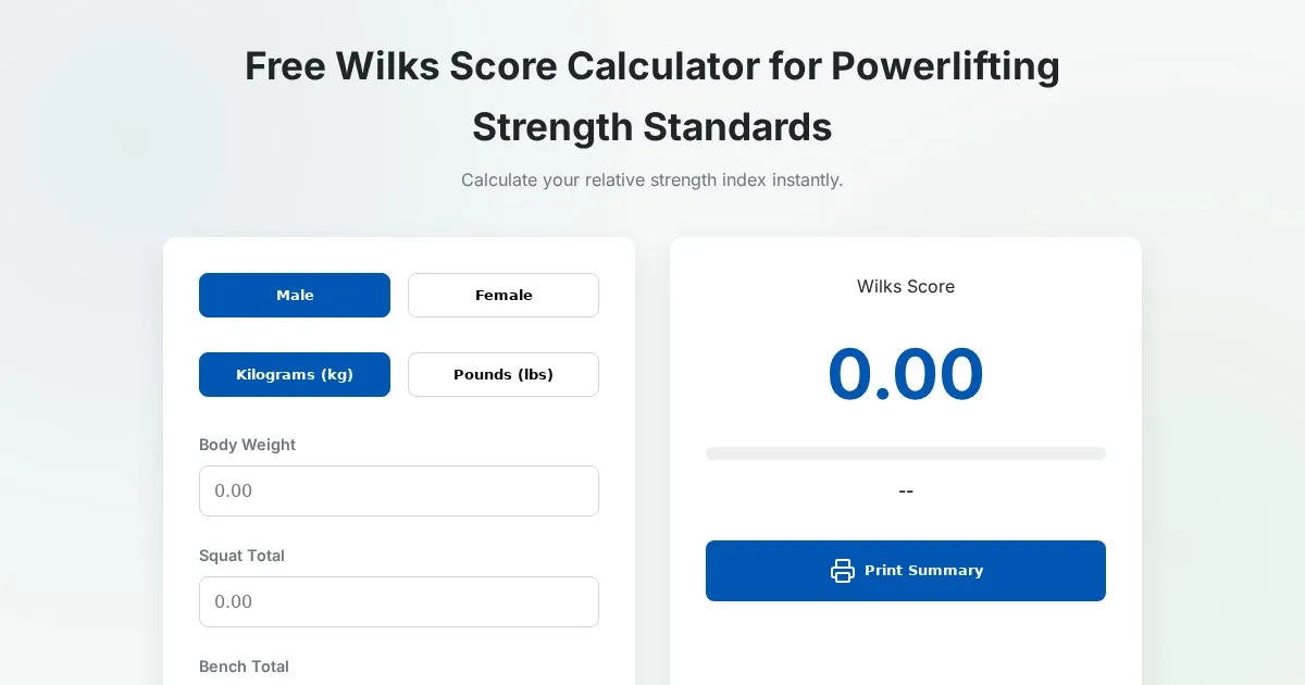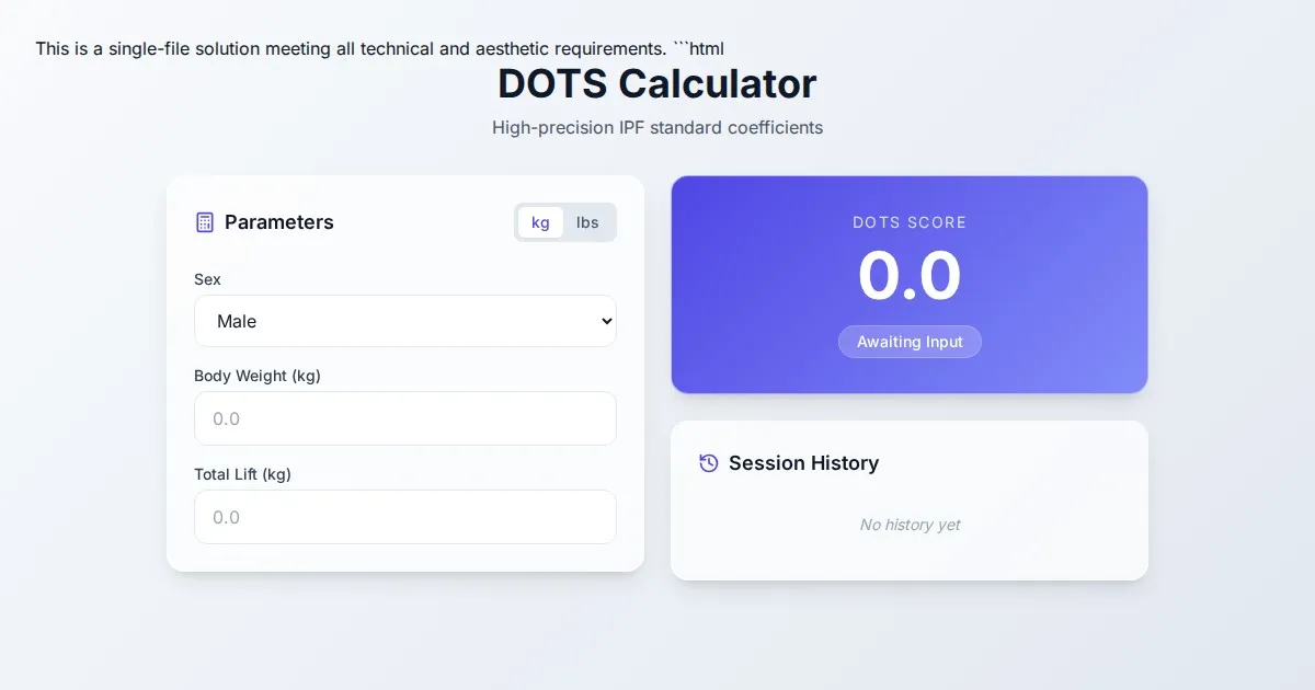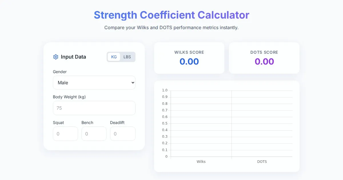 Compare powerlifting performance using Wilks and DOTS coefficient formulas. Visualize your strength progress with this free browser-based strength calculator tool.