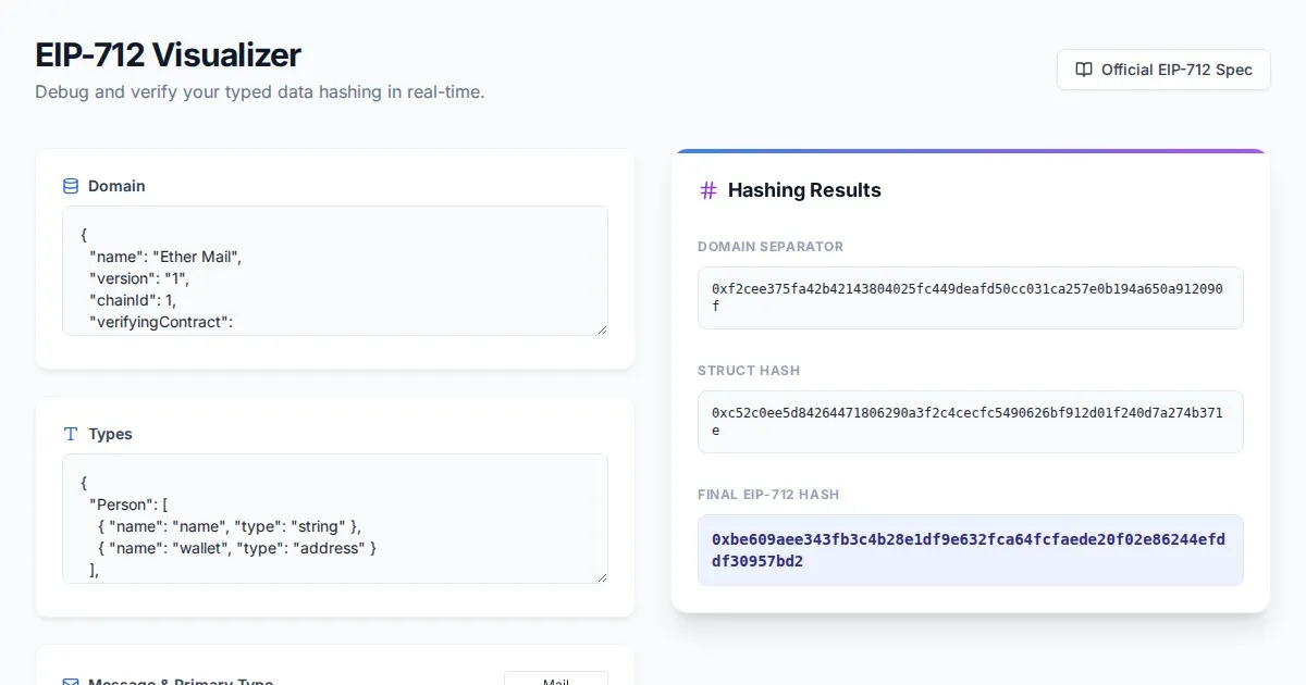 Use this free, browser-based EIP-712 visualizer to debug and hash Ethereum typed structured data. Validate your domain separator and message hashes instantly.