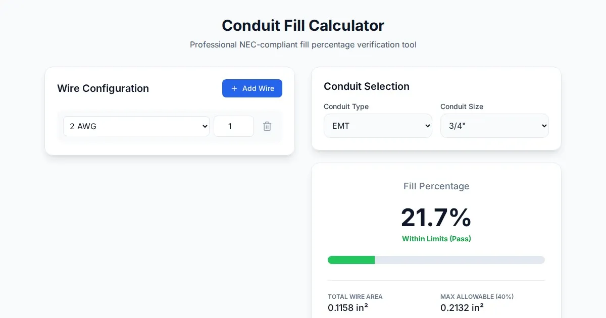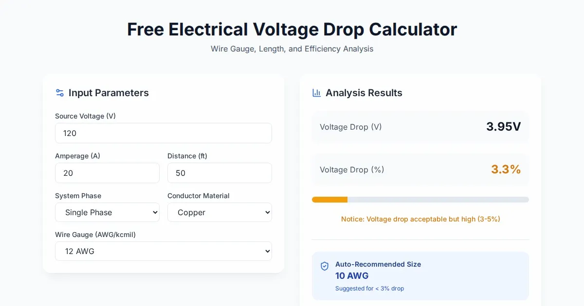 Calculate electrical voltage drop for AC and DC circuits instantly. Determine the correct wire gauge size based on load, length, and material. Free electrician tool.