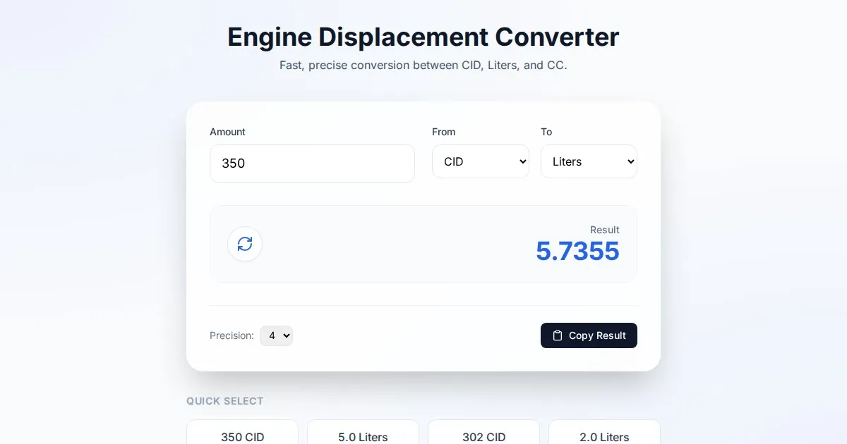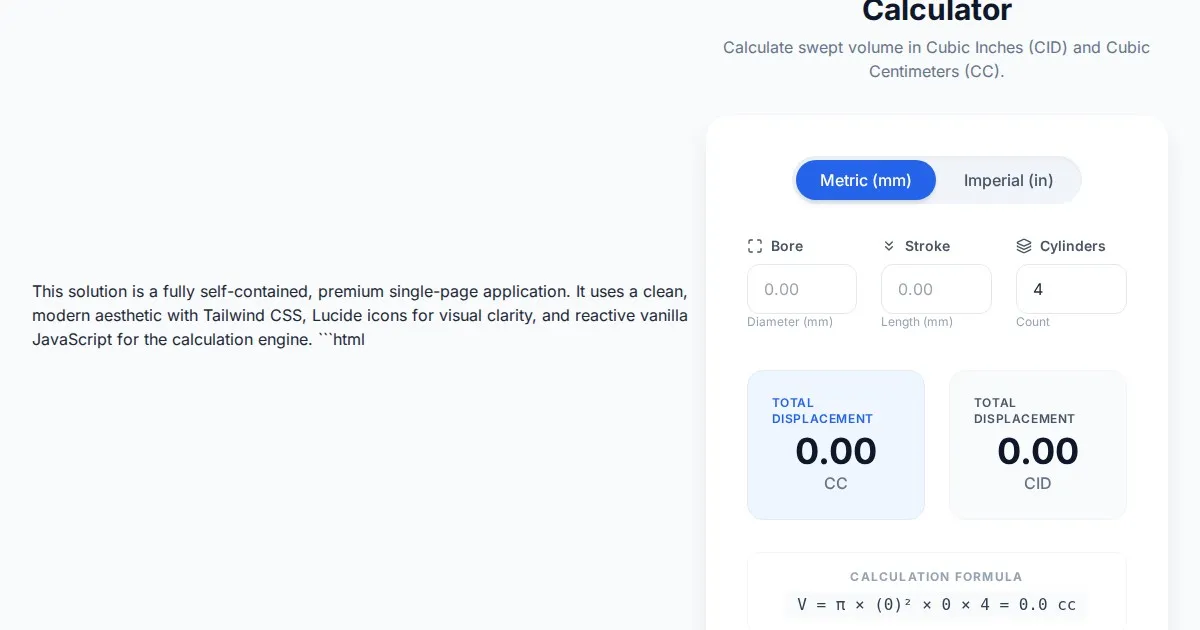 Calculate engine displacement volume accurately. Determine cubic inches or cubic centimeters based on bore, stroke, and cylinder count with this free web tool.