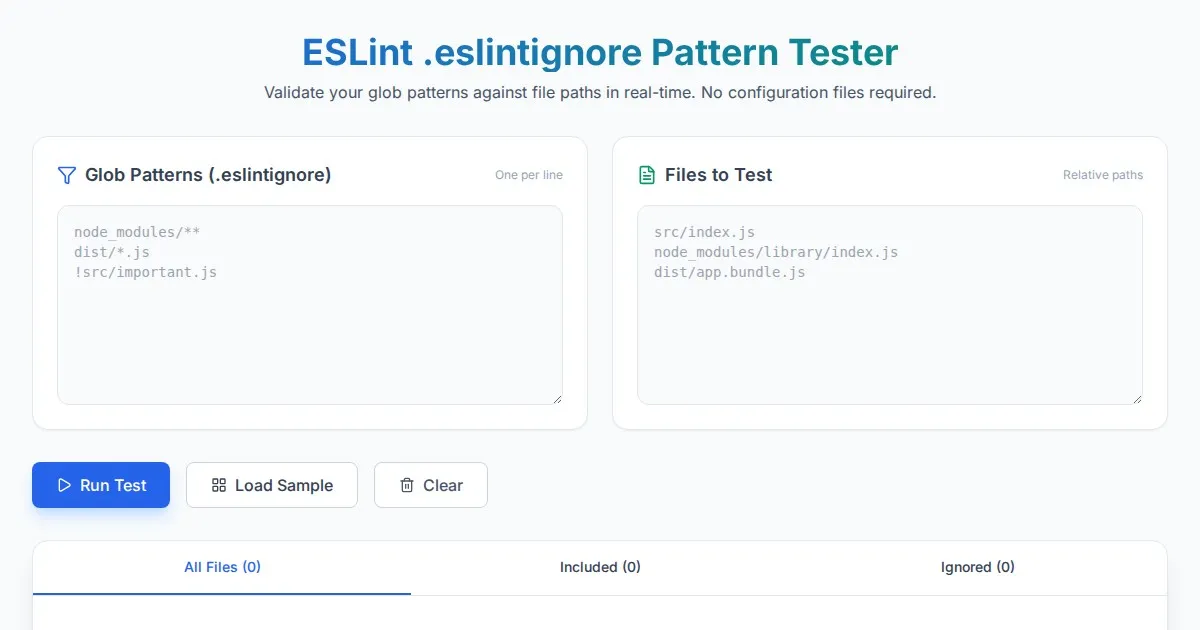 Easily test your .eslintignore glob patterns against file lists. Validate ESLint ignore configurations instantly with this free, client-side browser tool.