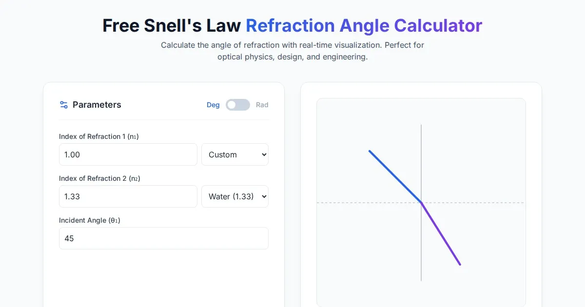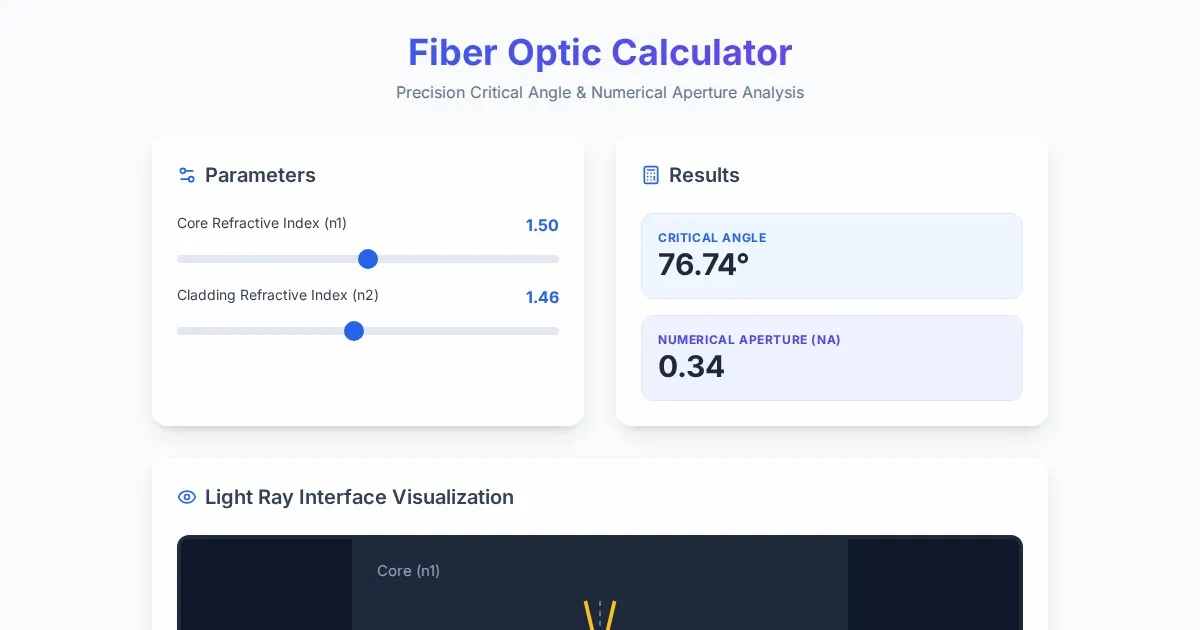 Calculate the critical angle for total internal reflection in fiber optics. Determine the numerical aperture and visualize light behavior with this free tool.