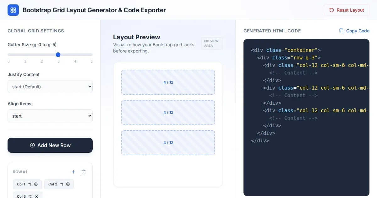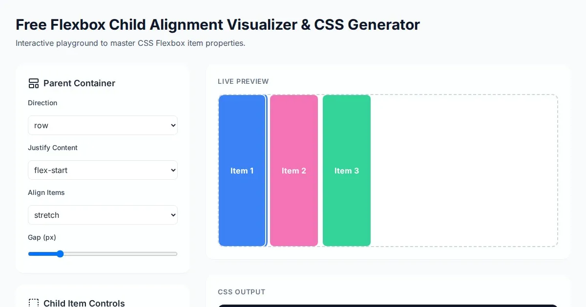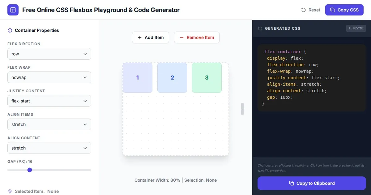 Visualize and generate CSS Flexbox code instantly. A free, interactive playground to test flex properties like justify-content, align-items, and gap effortlessly.