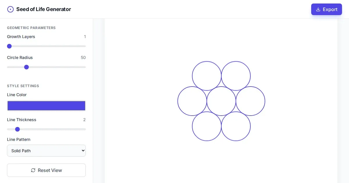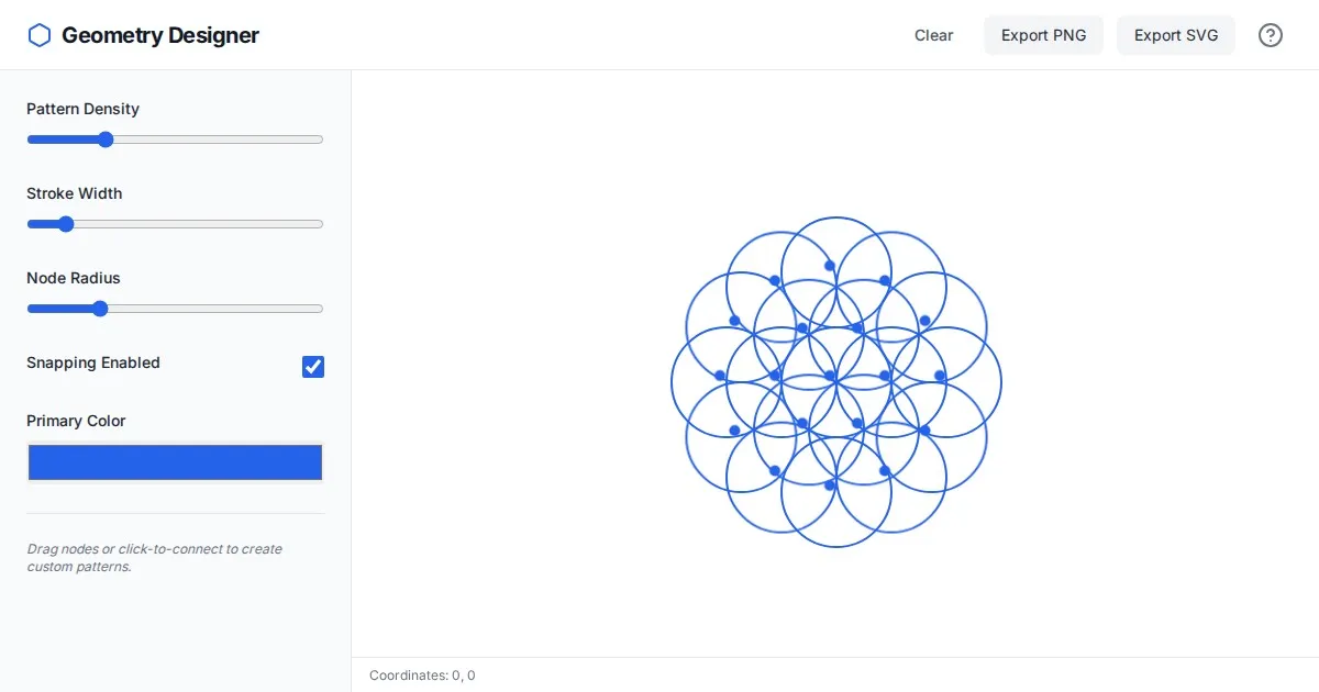 Easily design intricate Flower of Life sacred geometry patterns online. Use this free, browser-based tool to connect nodes, customize grids, and export your art.