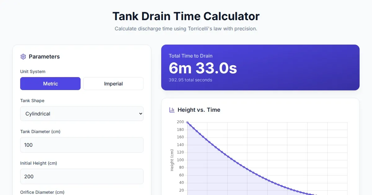 Accurately calculate tank drainage time using Torricelli's Law. This free, browser-based physics tool helps engineers and students estimate fluid flow rates.