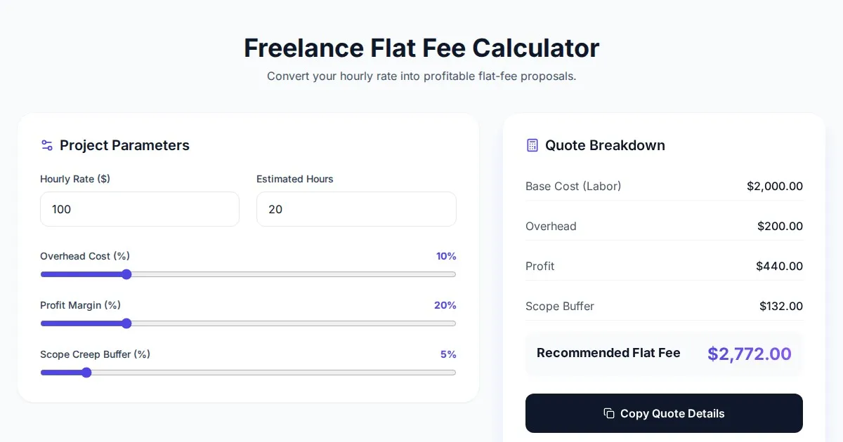 Convert your hourly freelance rate to a profitable flat project fee effortlessly. Use this free calculator to estimate costs, taxes, and overhead automatically.