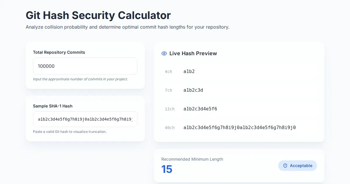 Calculate the probability of git commit hash collisions and determine the safest minimum length for your SHA-1 abbreviated hashes with this free utility.