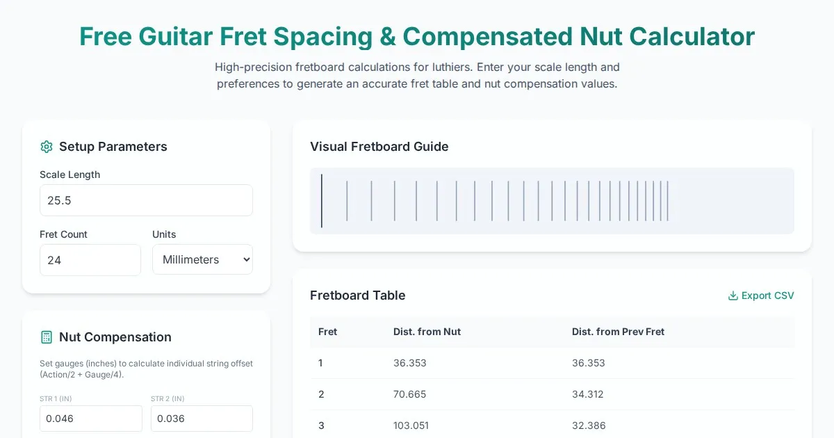 Easily calculate precise guitar fret positions and compensated nut offsets. An essential free online luthier tool for accurate fretboard layout and intonation.