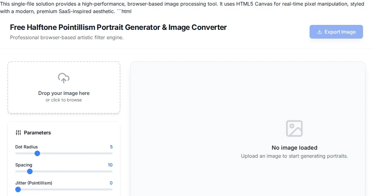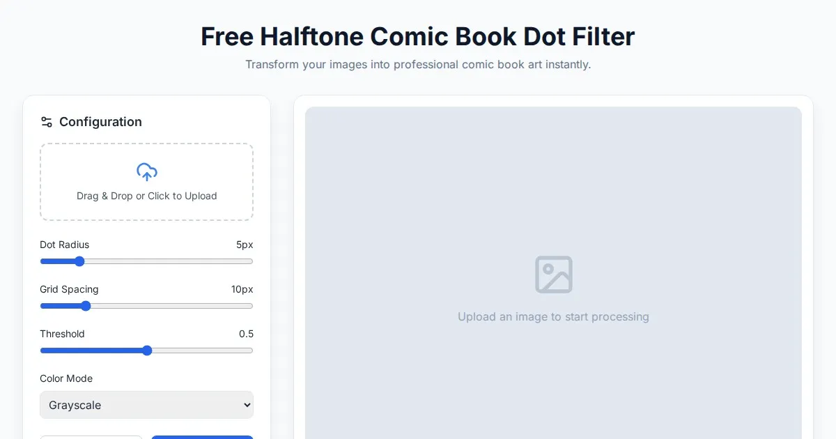 Easily convert your photos into professional halftone pointillism art with our free browser-based generator. Adjust dot size, density, and contrast in real-time.