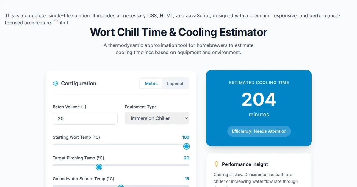Accurately estimate homebrew wort cooling time based on groundwater temperature, batch size, and chiller type. Optimize your brewing efficiency for free.
