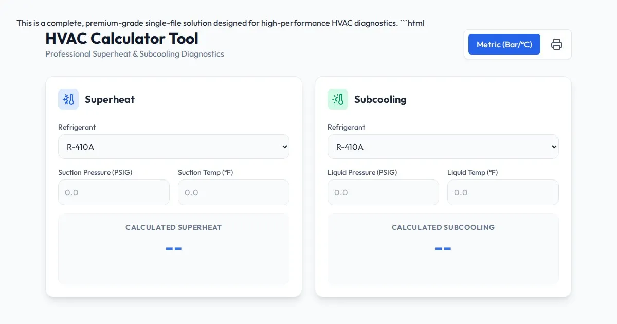 Calculate HVAC superheat and subcooling instantly. Free online refrigerant charging tool for HVAC technicians to verify system performance and troubleshoot.