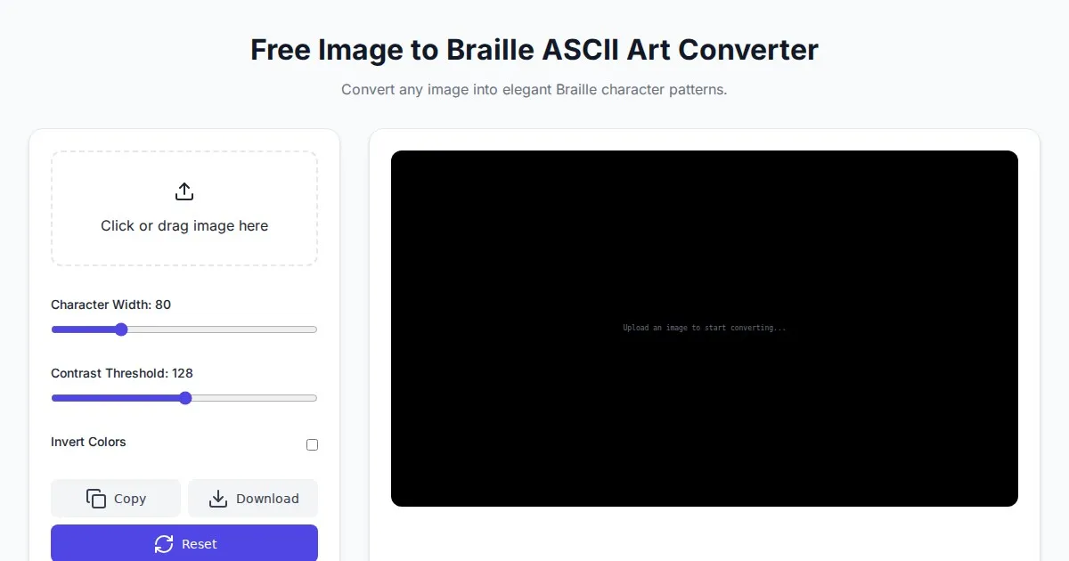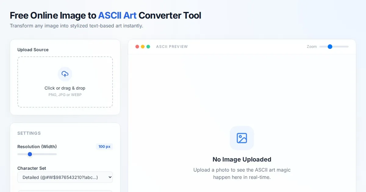 Instantly convert your images into high-quality ASCII art with this free online tool. Adjust resolution, character sets, and export to text or image files.