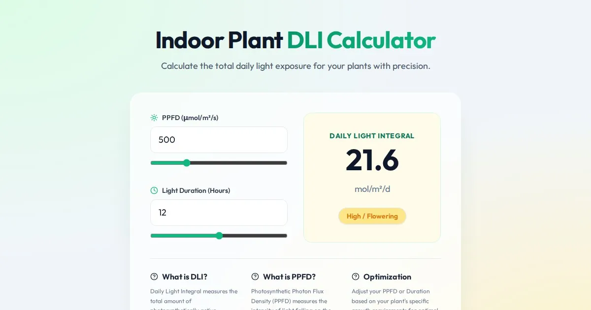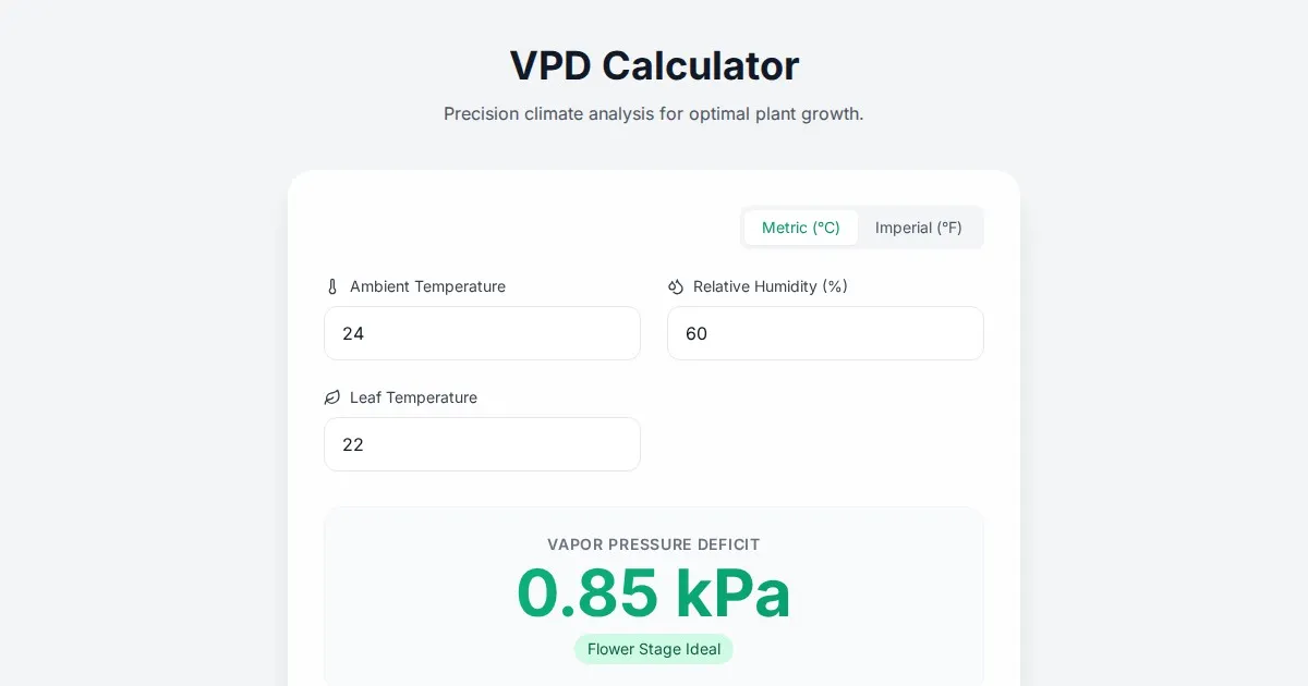Calculate accurate Vapor Pressure Deficit (VPD) levels for indoor gardening. Optimize plant transpiration, growth rates, and health with our free online tool.
