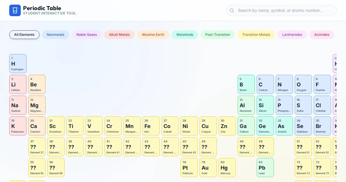 Access a comprehensive, free online interactive periodic table. Search elements, view atomic data, electron configurations, and group properties instantly.