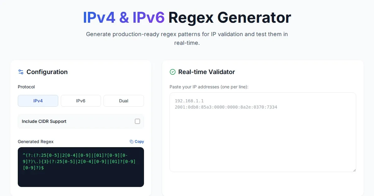 Instantly generate strict Regular Expression (RegEx) patterns for IPv4 and IPv6 address validation. A free, client-side browser tool for developers.